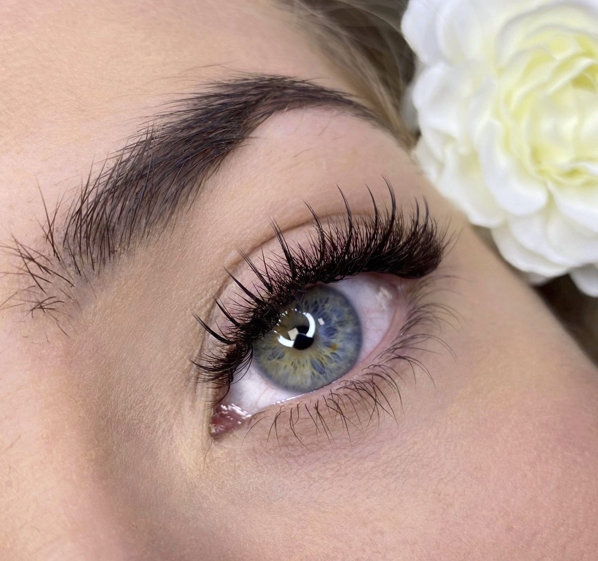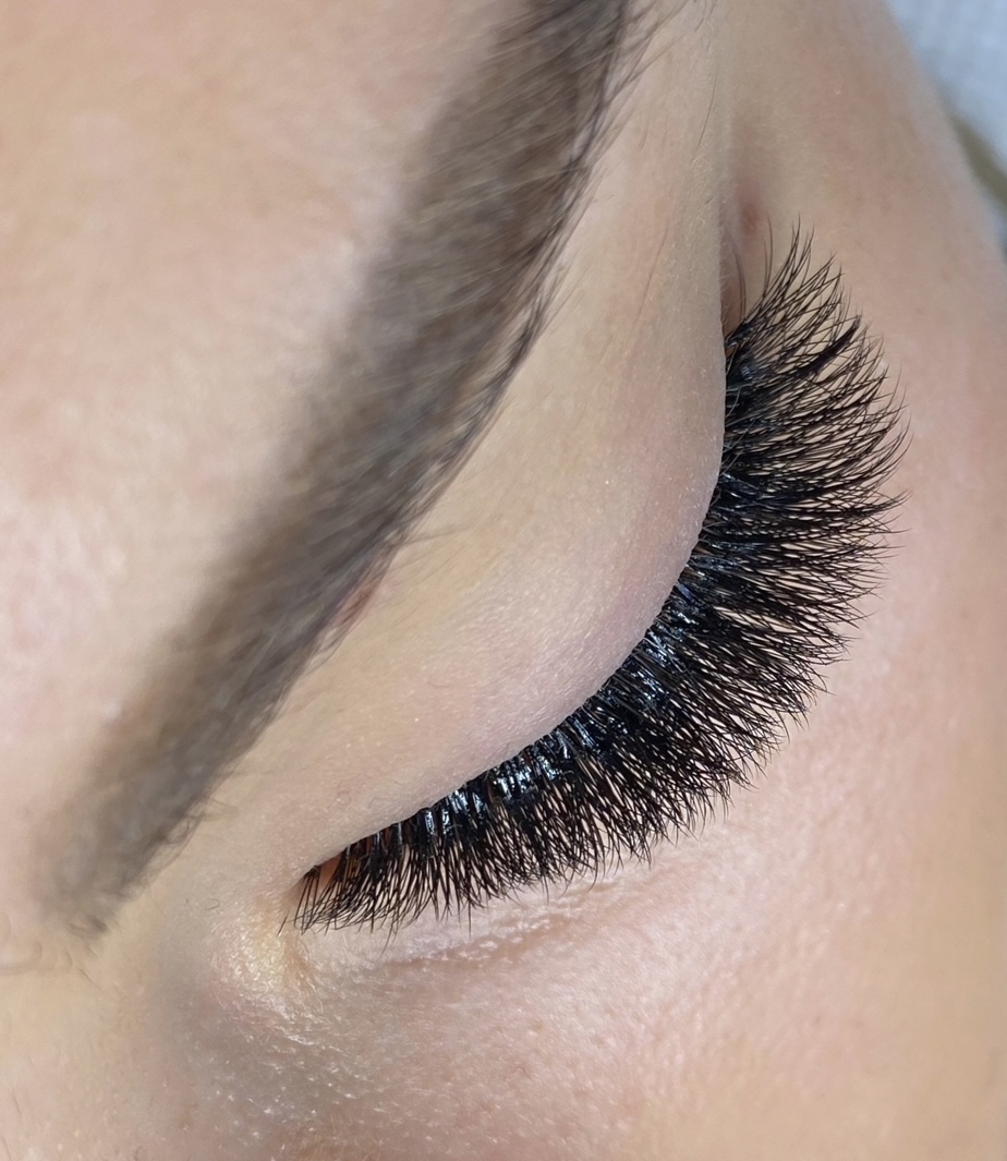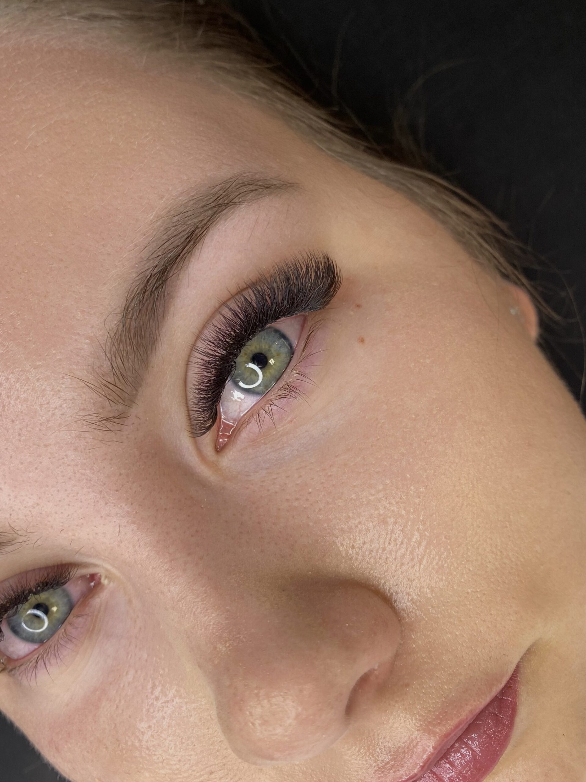 Przedłużanie rzęs metodą objętościową (2D-6D), gdzie do każdej naturalnej rzęsy doklejane są kępki złożone z kilku sztucznych rzęs.
